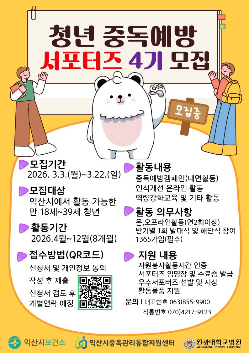 익산시 중독관리통합지원센터 청년 중독예방 서포터즈 4기 모집 안내 2026/03/17 [익산시 중독관리통합지운센터 청년 중독예방 서포터즈 4기 모집 안내] ○ 활동내용 : – 중독 폐해 예방 관련 행사 참여 및 캠페인 Read More »