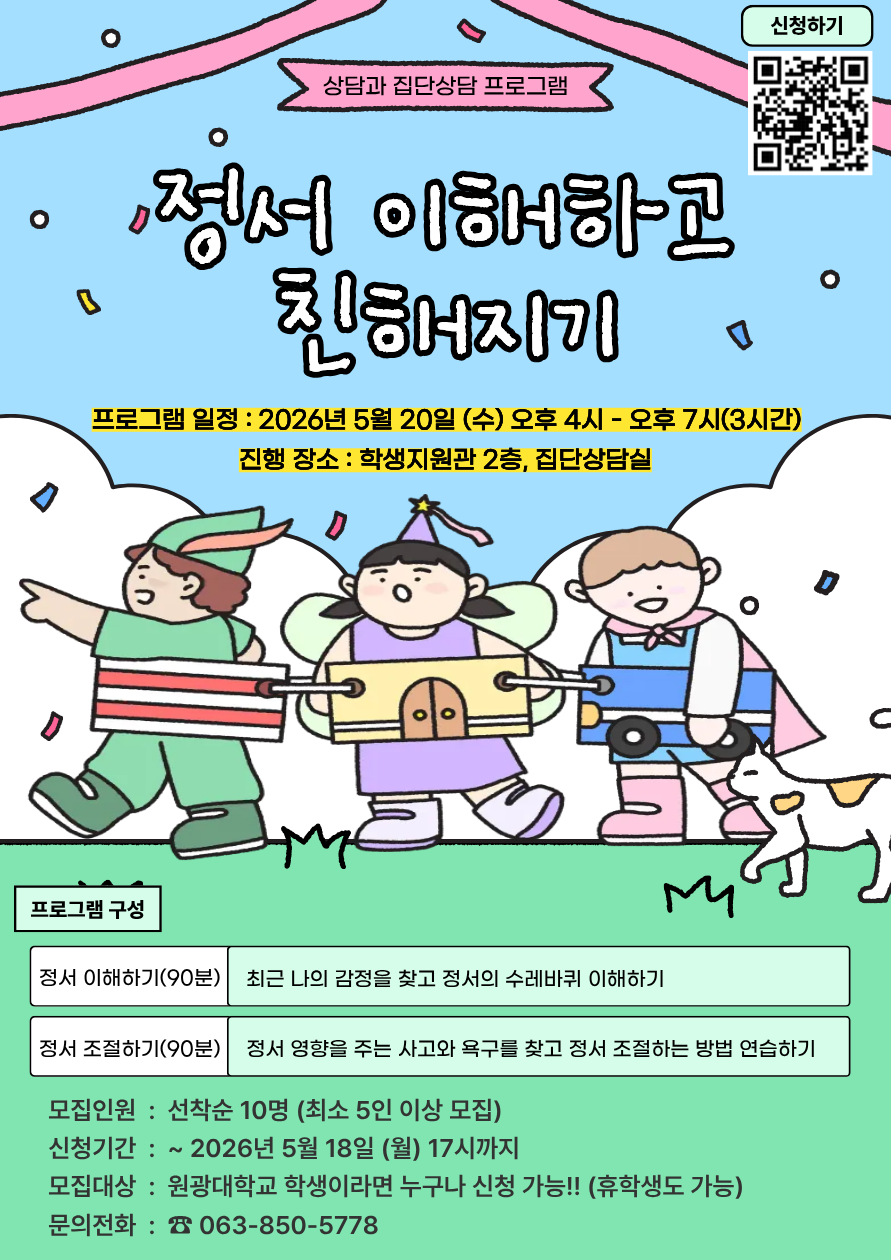 [2026-1] 정서조절 집단상담 프로그램 2026/03/17 안녕하세요. 학생케어센터 상담과에서 정서조절 집단 ‘정서 이해하고 친해지기’ 프로그램을 운영합니다. · 운영일시 : 2026년 5월 20일 (수) 16~19시 · 진행방법 Read More »