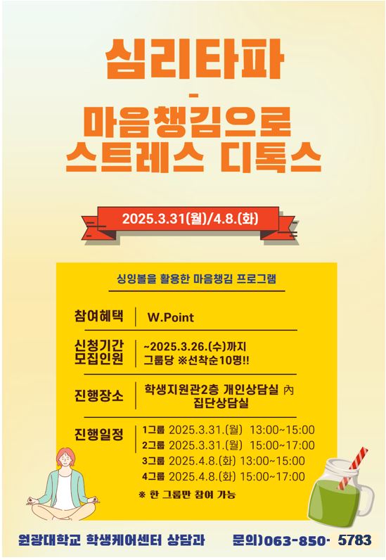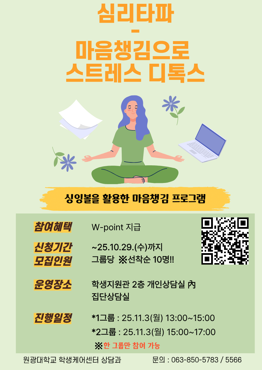 [2025-2] 마음챙김으로 스트레스 디톡스 프로그램 2026/03/17 안녕하세요! 학생케어센터 상담과에서 진행하는 ‘마음챙김으로 스트레스 디톡스 프로그램’ 참여하고 W-point 받아가세요🎁 ■운영일시 : 1그룹 2025.11.3(월) 13:00~15:00 2그룹 2025.11.3(월) 15:00~17:00 ※한 Read More »